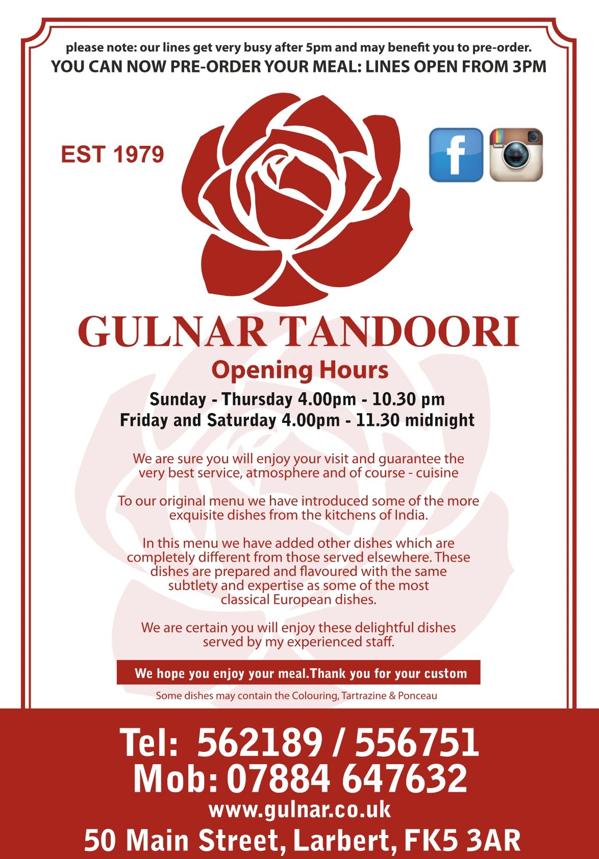We offer a rotating buffet menu that changes weekly, deauthuring six delicious menus in total. Each week brings a new selection - perfect for trying something different every time you visit! The buffet is available everyday from 4pm. Want to know what's on this week? Give us a call to find out which menu we're serving and to book your table - 01324 562189